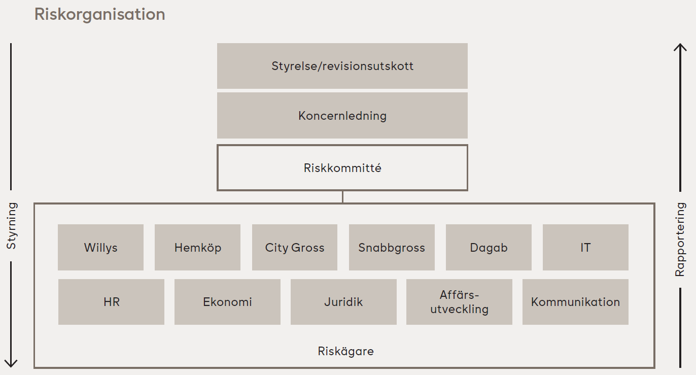Risker klassificeras och kategoriseras efter hur väl genomförda motåtgärder som finns på plats. Inom Axfood finns en riskkommitté som leds av koncernens Risk Manager. Riskkommittén har som uppgift att bland annat följa planerade motåtgärder samt konsolidera de risker som inventerats av respektive riskägare. Sammanställningen görs centralt och sammanfaller tidsmässigt med koncernens arbete med affärsplan vilket underlättar budgetering för beslutade motåtgärder. För en beskrivning av organisation, styrning och rapportering av riskhanteringen, se illustrationen nedan. City Gross, som förvärvades den 1 november 2024, har under 2025 integrerats i koncernens riskhanteringsprocess.